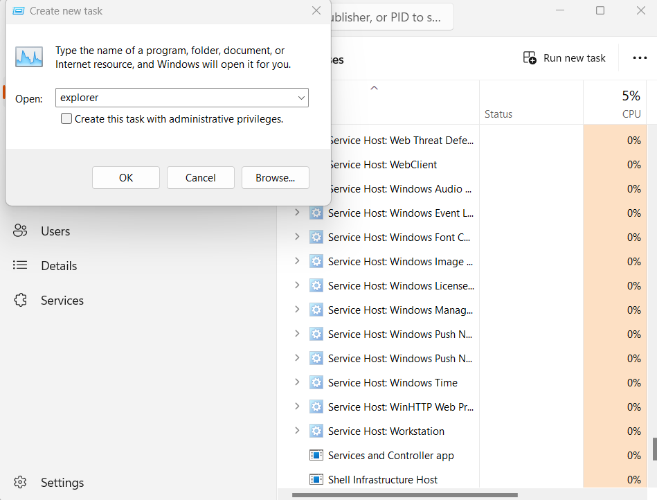 4. Digita esploratoreCrea nuova attivitàfinestra. Inoltre, controllaCrea questa attività con privilegi amministrativi.