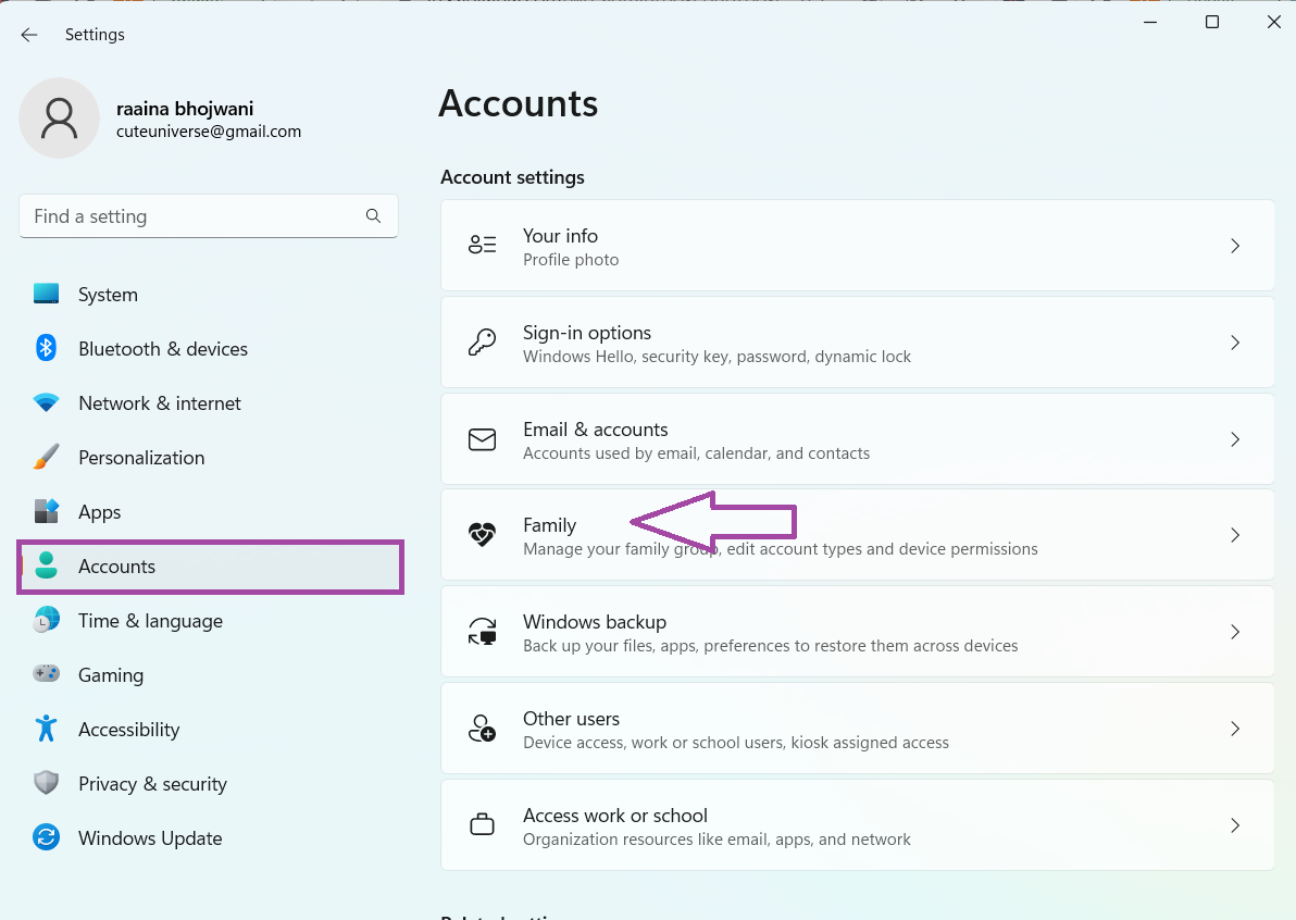 2. Quindi fare clic suContinel riquadro sinistro > fare clic suFamiglianel riquadro di destra.