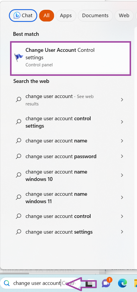 1. ApriModifica il controllo dell'account utentecercandolo sulla barra di ricerca.