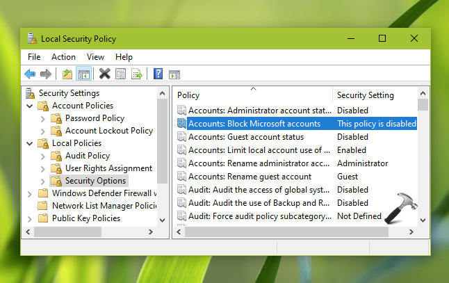 3.Assicurati cheAccount: blocca gli account Microsoftl'impostazione del criterio è impostata su Lo stato di questo criterio è disabilitato. Chiudi lo snap-in Criteri di sicurezza e prova a passare all'account locale.