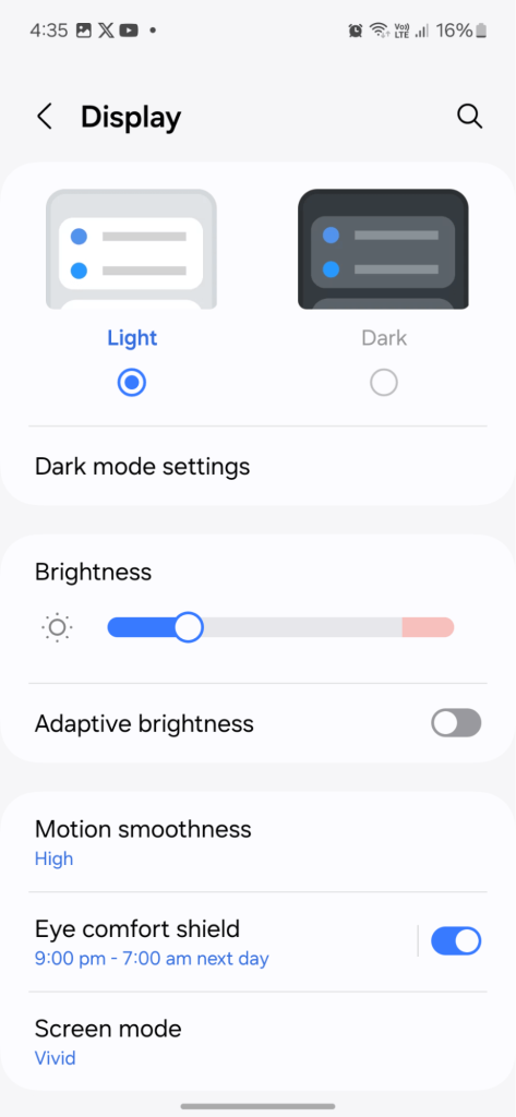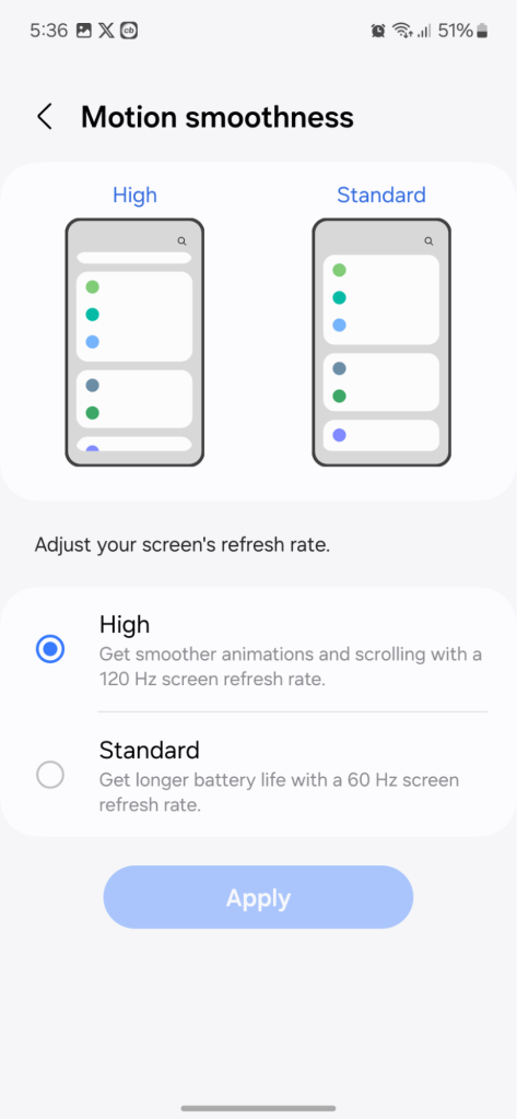 Se possiedi uno smartphone del 2022 o successivo, è probabile che sia dotato di un display con frequenza di aggiornamento di 120Hz. Sebbene questa frequenza di aggiornamento più elevata migliori la fluidità delle animazioni e delle operazioni, ha anche un costo sulla durata della batteria del telefono. La frequenza di aggiornamento dello schermo gioca un ruolo significativo nel consumo della batteria, in particolare se abbinata alle richieste ad alta intensità energetica dei servizi 5G. Per mitigare il consumo della batteria durante l'utilizzo dei servizi 5G, valuta la possibilità di regolare la frequenza di aggiornamento del tuo dispositivo su uno standard di 60 Hz. Questa semplice regolazione può aiutare a preservare la durata della batteria senza compromettere le prestazioni generali.