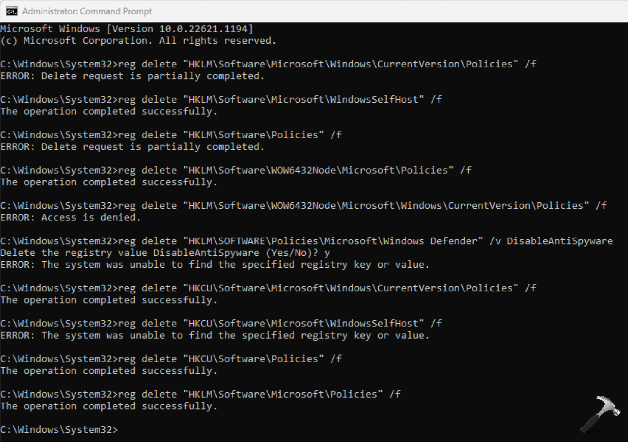 reg delete "HKLMSOFTWAREPoliciesMicrosoftWindows Defender" /v DisableAntiSpyware