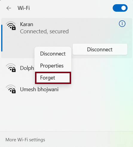 3. Fare clic con il tasto destro sulla rete che si desidera rimuovere e scegliere "Dimentica".