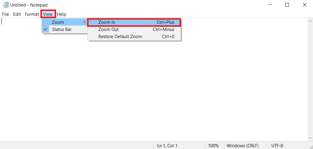 2.Fare clic suVisualizzazionebarra dei menu dalla finestra Blocco note e selezionare il fileZoomopzione. Quindi, seleziona ilZoom avantiper espandere la dimensione del testo secondo le tue necessità.