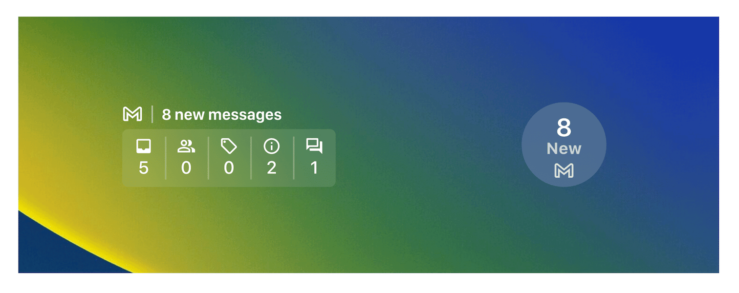 - Widget schermata di blocco di Gmailvisualizzerà le email più recenti e aggiornerà automaticamente il numero di nuovi messaggi nella posta in arrivo. Può anche essere personalizzato per mostrare categorie di posta in arrivo come aggiornamenti o social.