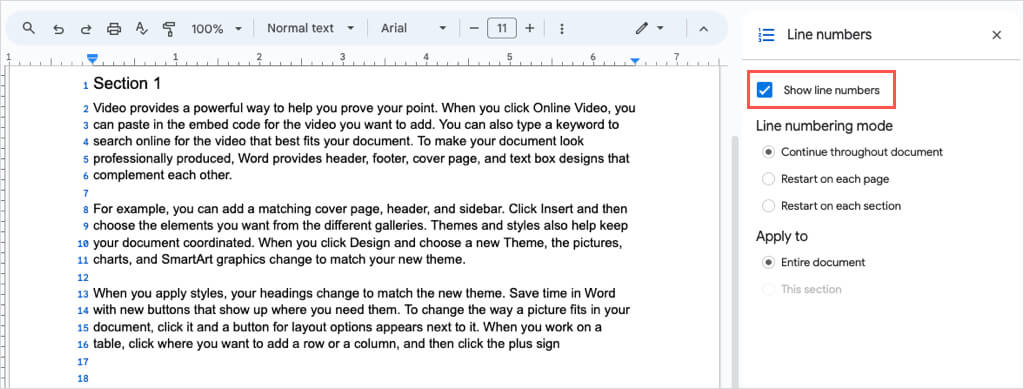 Puoi sceglierne uno traModalità di numerazione delle righeper sapere come numerare il documento, compreso l'intero documento, o ricominciare da 1 su ogni pagina o sezione.