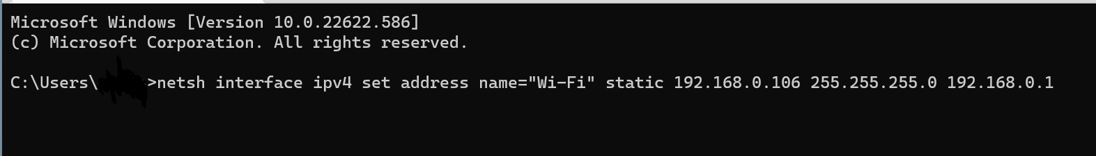 netsh interface ipv4 set address name="Wi-Fi" static 192.168.0.106 255.255.255.0 192.168.0.1