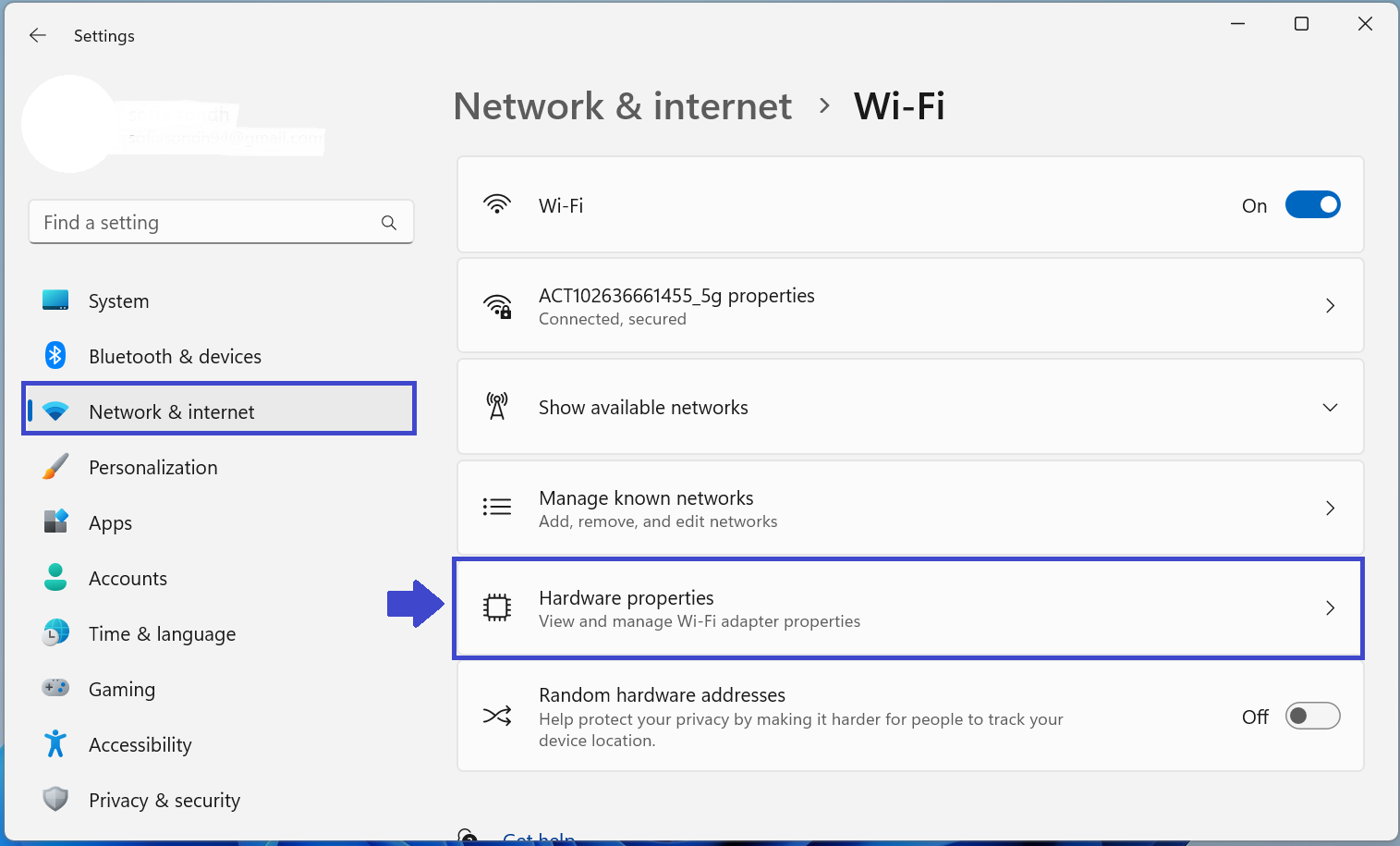 Dopo aver selezionato Wi-Fi, fare clic su Proprietà hardware.