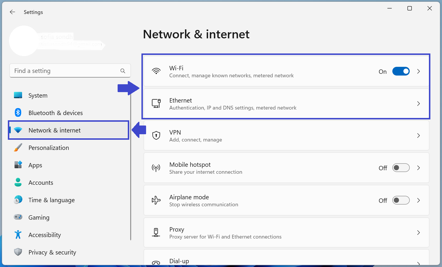 PASSO 2:Nel pannello di destra, fai clic sul tipo di rete che stai utilizzando (Wi-Fi o Ethernet).