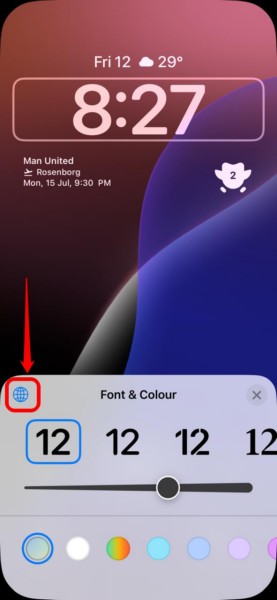 6.NelInterfaccia utente a comparsa carattere e colore, toccapulsante globo (circolare).nell'angolo in alto a destra per accedere a tutte le lingue supportate per l'orologio della schermata di blocco.