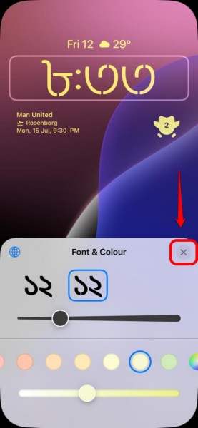 9.Una volta che sei soddisfatto della personalizzazione dell'orologio della schermata di blocco, toccapulsante xsull'interfaccia utente Font e colori per chiuderla.
