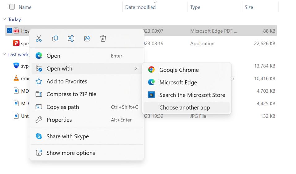 Questa opzione ti consente di scegliere quale app desideri utilizzare per aprire un file PDF da un elenco di app disponibili sul tuo PC. È un metodo semplice e veloce senza passare attraverso il menu delle impostazioni.