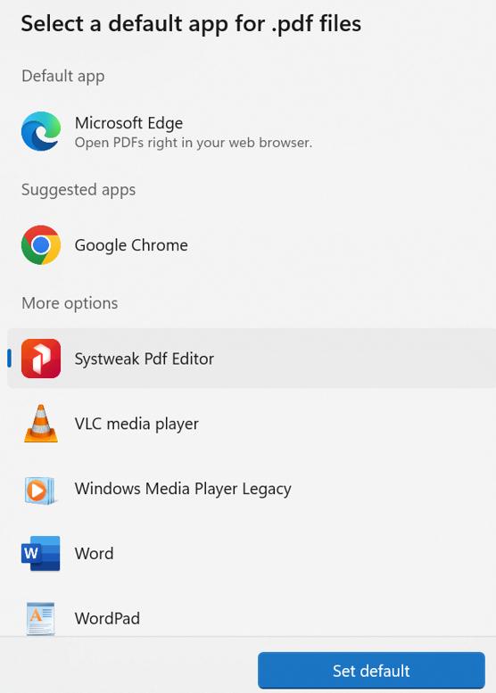 Passaggio 7:Fai clic sull'opzione Imposta predefinito dopo aver selezionato il software che desideri utilizzare come lettore PDF predefinito. Di conseguenza, il tuo software preferito diventerà il tuo lettore PDF predefinito.