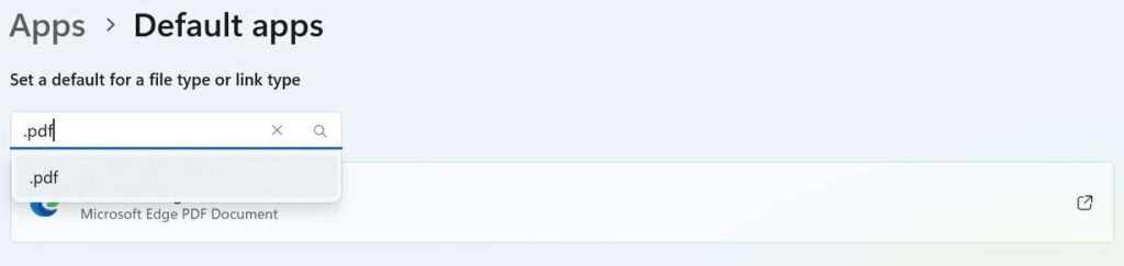 Passaggio 4:Digita ".pdf" nella casella di ricerca sotto "Imposta un valore predefinito per un file..." e verrà visualizzata l'app predefinita corrente per aprire i PDF.