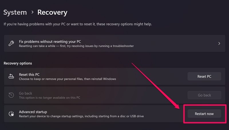 3.Nella pagina successiva, fare clic suRicomincia adessoaccanto aAvvio avanzatoopzione nella sezione Opzioni di ripristino.