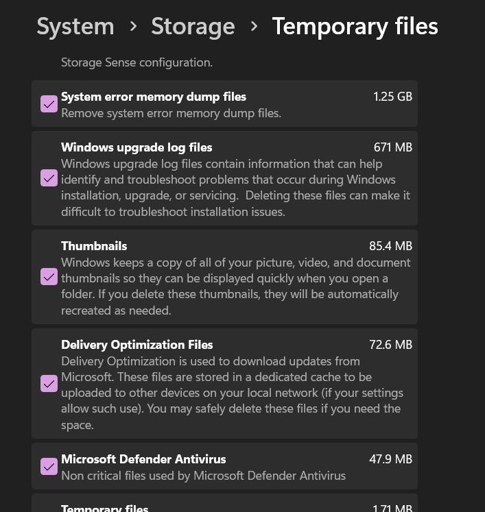 Passaggio 4:Una volta terminata l'analisi, vedrai un elenco di categorie di file che possono essere rimosse. Scorri verso il basso e individua l'opzione "Miniature".