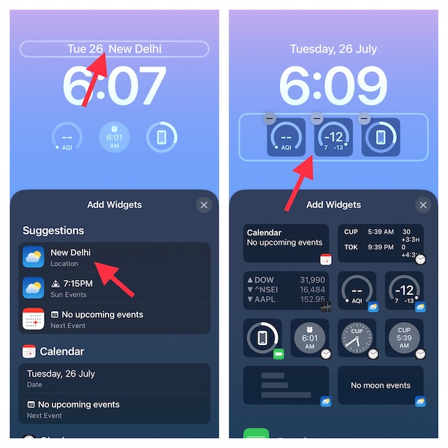 Tieni presente che puoi anche mostrare un elegante widget sopra il tempo tra la data e la lettura della data. Basta toccarela data e la lettura della dataper rivelare il selettore dei widget e quindi toccare il widget che desideri aggiungere.