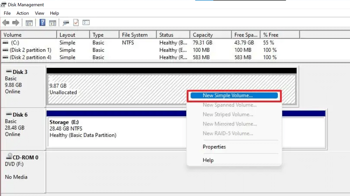 - Fare clic con il pulsante destro del mouse sull'unità con "Non allocato" e seleziona "Nuovo volume sempliceopzione.