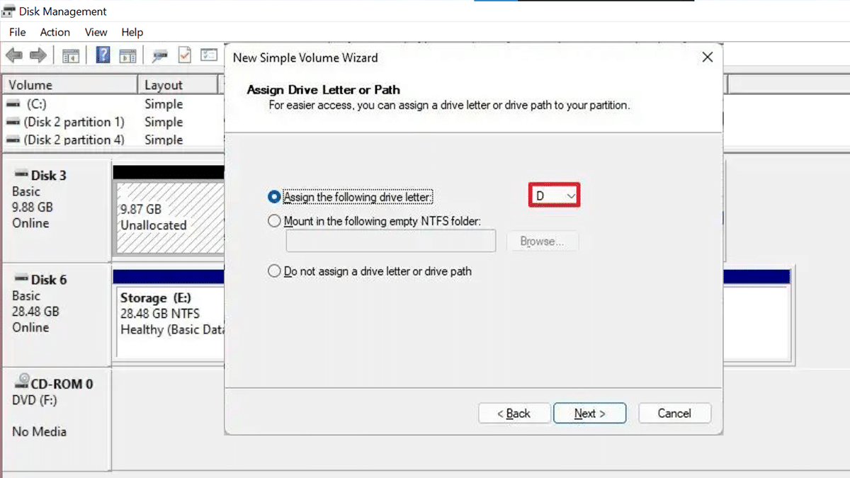 - Fare clic suProssimopulsante > selezionare il pulsante "Assegnare il seguente driver" e scegli la lettera per la nuova partizione.
