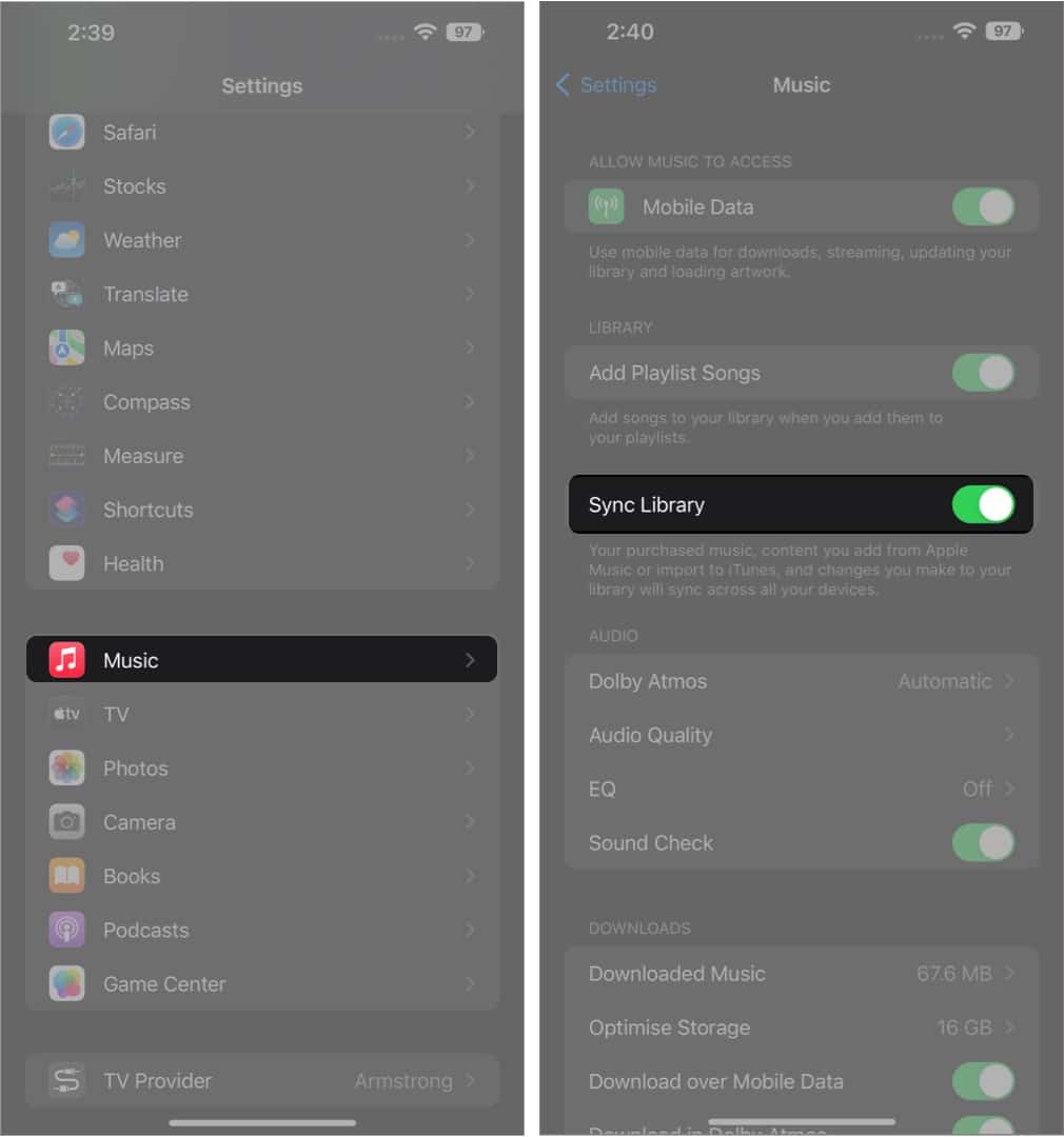 Sull'iPhone:Impostazioni ➝ Musica ➝ Sincronizza libreria.