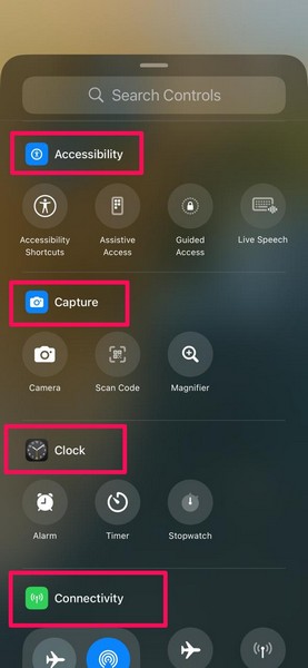 4.Ora,sfogliare i controlli preimpostatielencati nella seguente pagina Aggiungi un controllo scorrendo verso l'alto o verso il basso. Troverai varie nuove opzioni di controllo elencate nelle sezioni dedicate comeAccessibilità,Catturare,Orologio,Connettività,Display e luminositàe molti altri.