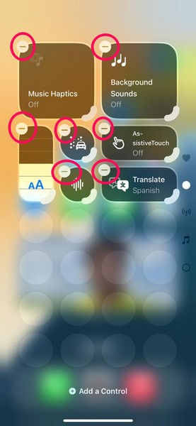 Quindi, se desideri rimuovere un'opzione di controllo dal Centro di Controllo del tuo iPhone su iOS 18, apri il Centro di Controllo, entra nella modalità Personalizza e tocca l'iconapulsante meno (-).situato in alto a destra di ciascuna delle opzioni di controllo per rimuoverle dallo spazio.