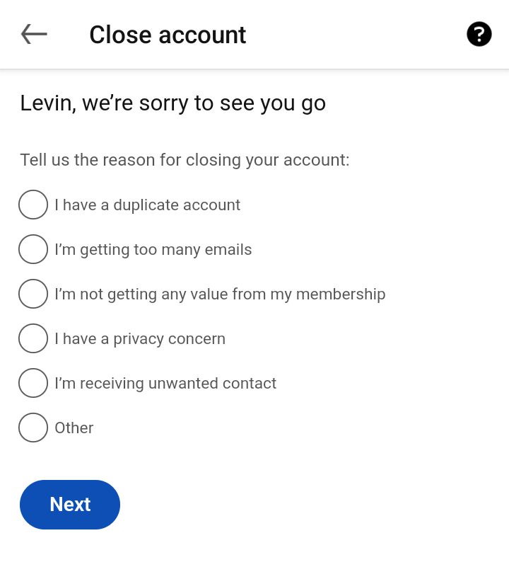 - Ora scegli un motivo per eliminare il tuo account LinkedIn, utilizzando il fileAltroopzione se desideri inserire un motivo personalizzato. RubinettoProssimoquando hai finito.