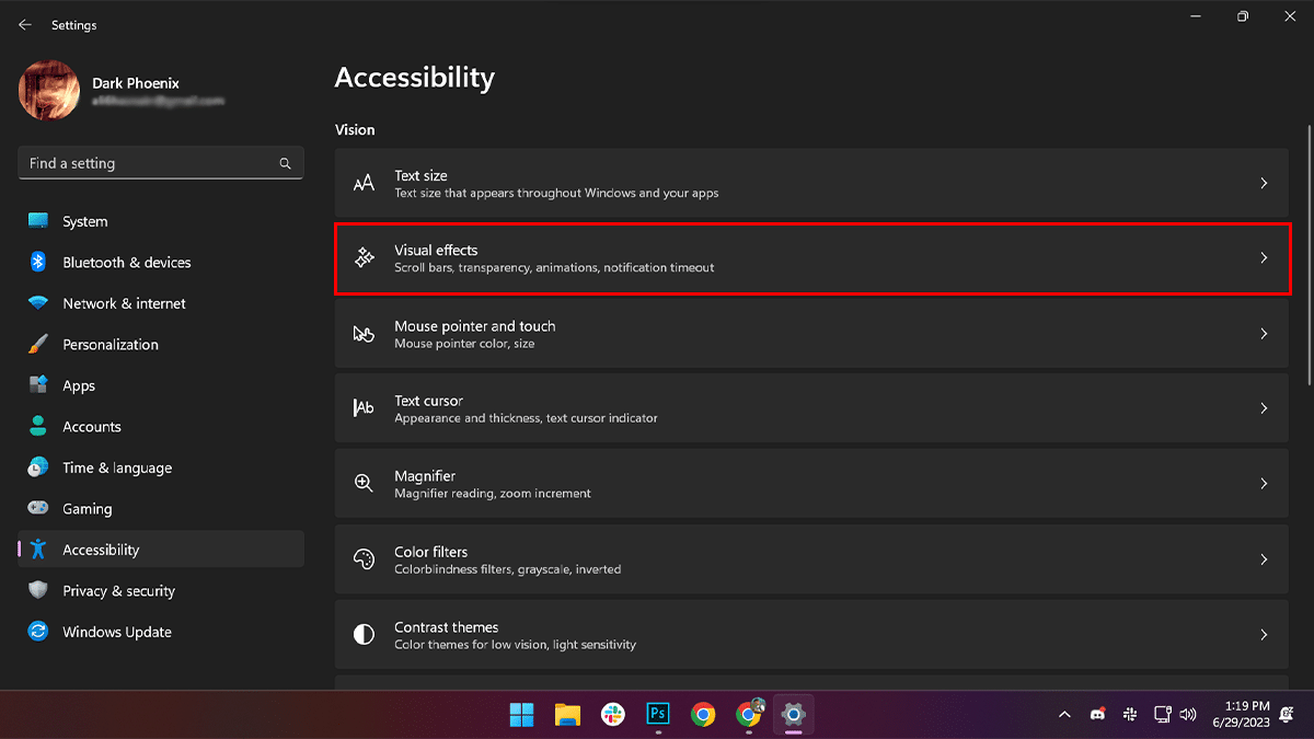 - Vai aAccessibilitàe fare clic suEffetti visivi.