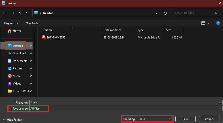 8.Nella pagina di salvataggio, seleziona una posizione come il desktop. Successivamente, modifica il tipo di file inTutti i filee, infine, assicurati di utilizzare soloANSIOUTF-8. Dopo aver eseguito tutte queste operazioni, fare clic suSalvapulsante.
