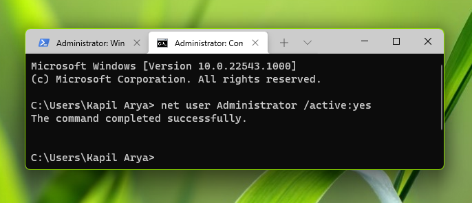 Una volta completato correttamente il comando, l'account amministratore integrato dovrebbe essere abilitato nel sistema.