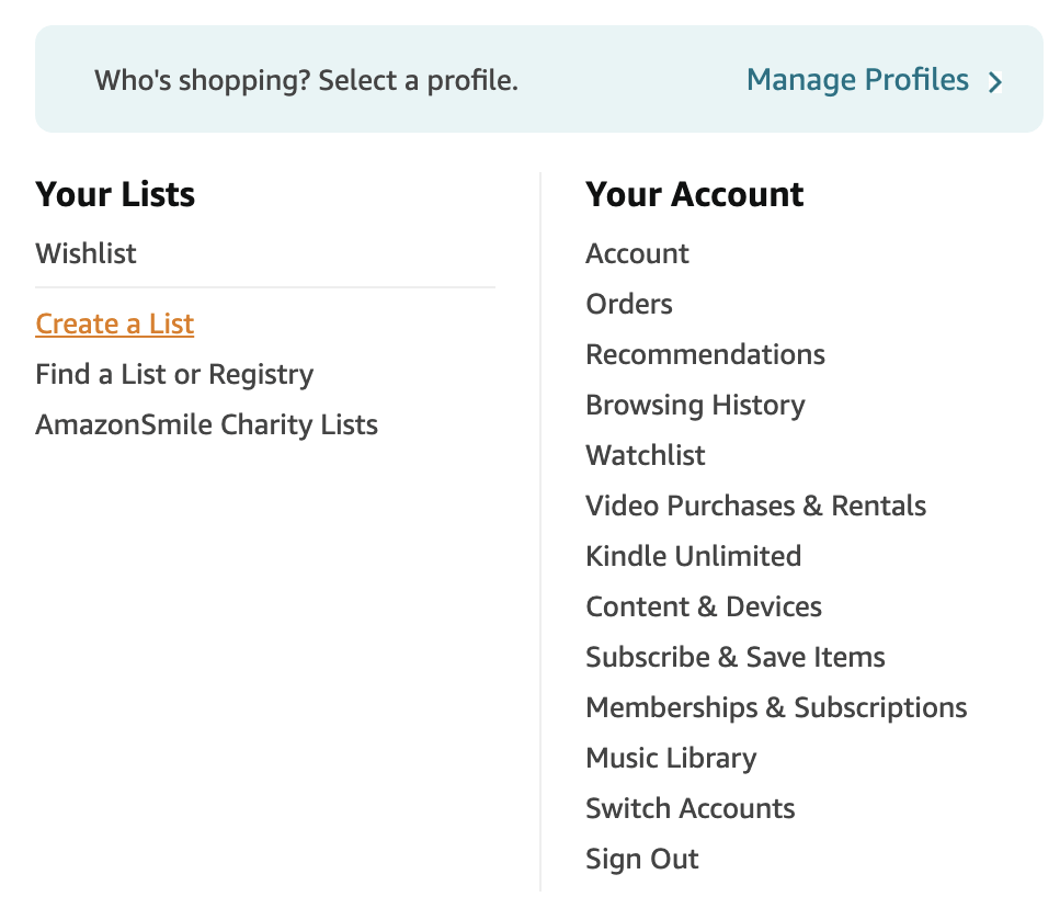 - Apri il sito web di Amazon e passa il mouse sopraConto ed elenchi.