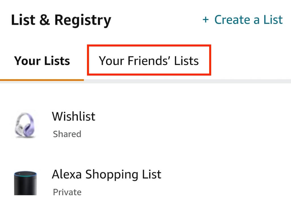 - SelezionareLe liste dei tuoi amiciper vedere tutte le liste dei desideri Amazon condivise con te.