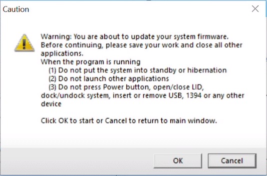 6.Alla fine, leggi il contenuto del fileAttenzionerichiesta. Una volta terminato, scegli ilOKpulsante inAttenzionefinestra per avviare il processo di aggiornamento del BIOS/firmware e riavviare il laptop.