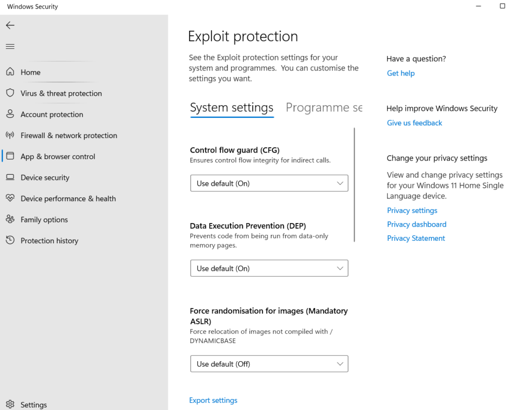 - Fare clic suControllo delle app e del browsere fare clic suImpostazioni di protezione dagli exploit