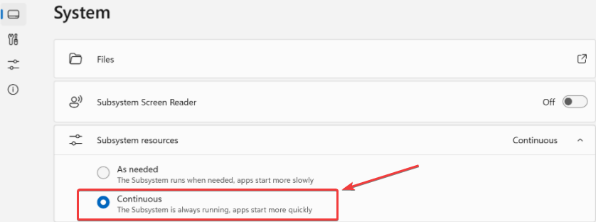 Un'altra soluzione che potrebbe funzionare nel caso in cui le app Android non funzionino sul tuo PC Windows è impostare le risorse WSA su continue. Ecco i passaggi per lo stesso: