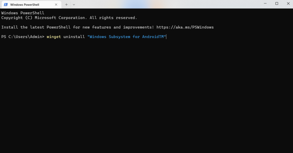 disinstallazione di Winget “Sottosistema Windows per AndroidTM”