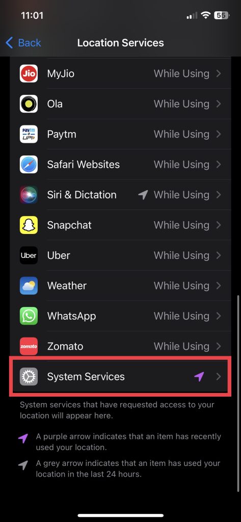 4.Inoltre, scorri fino alla fine dello schermo e visitaServizi di sistema.