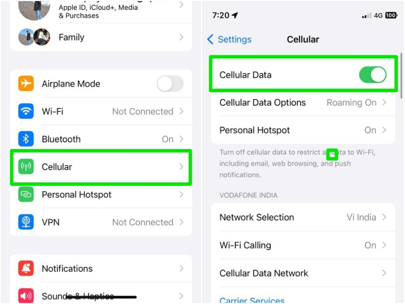 Una delle prime cose che dovresti controllare quando riscontri il problema del mancato funzionamento dei dati cellulari sul tuo iPhone è se il servizio è abilitato o meno. Esistono due modi per verificarlo sul tuo iPhone, entrambi discussi di seguito: