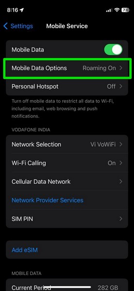 4.Qui, assicurati che l'interruttore perRoaming di datil'opzione èabilitatosul tuo dispositivo. In caso contrario, toccalo per abilitare l'opzione.