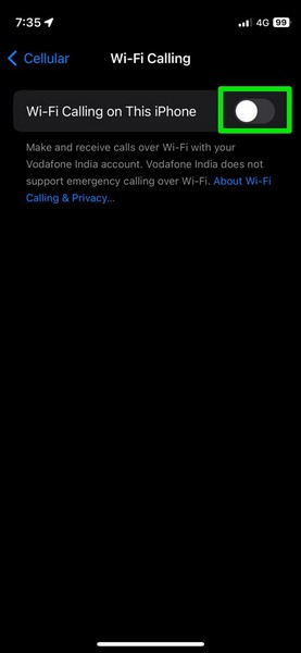 La funzione di chiamata Wi-Fi può aiutare a risolvere il problema delle chiamate non funzionanti sul tuo iPhone, ma a volte pone problemi per la funzione Dati cellulare sul tuo dispositivo. Quindi, puoi provare a disabilitare detta opzione sul tuo iPhone per verificare se risolve il problema dei dati cellulari non funzionanti sul tuo dispositivo.