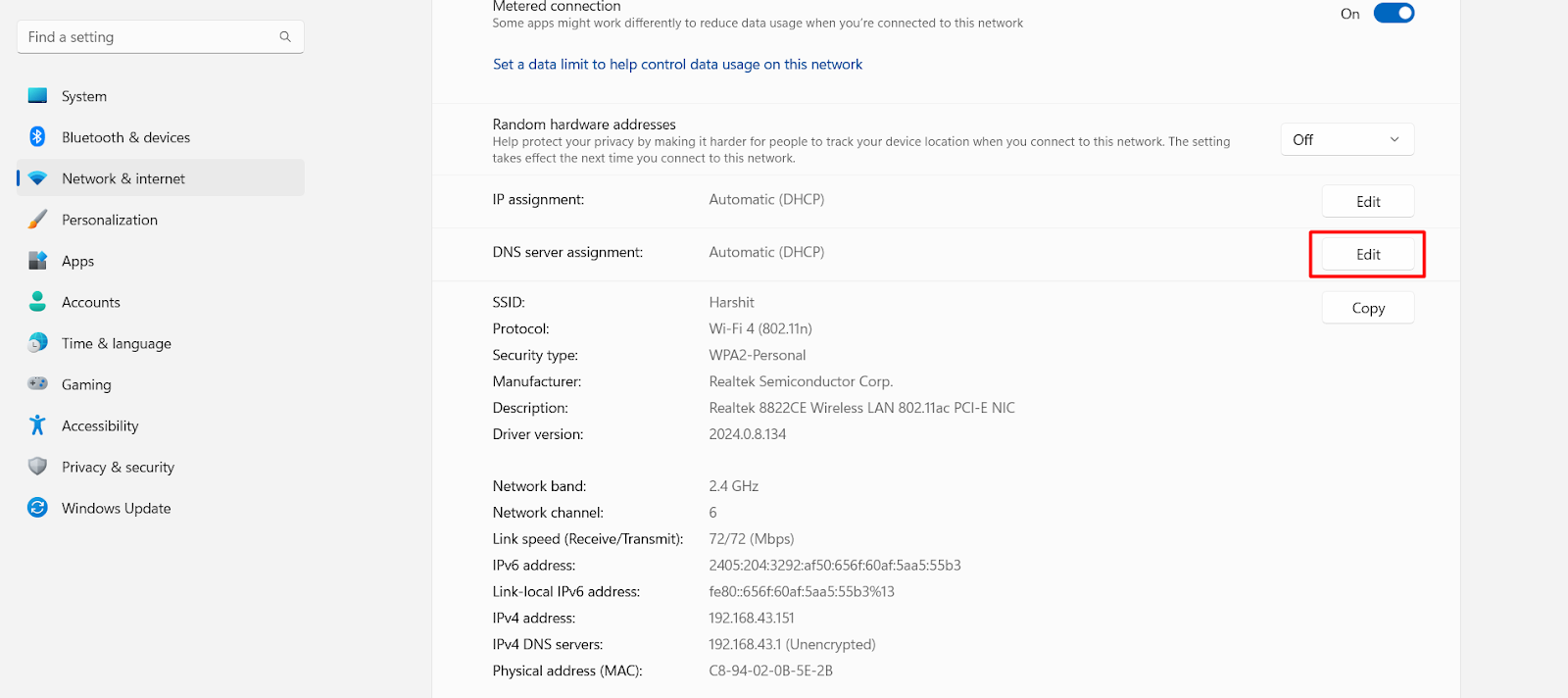 5.CercareAssegnazione del server DNSe fare clic suModificare.