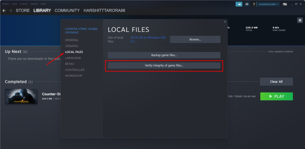 4.Spostati inAggiornamenti localie fare clic suVerifica l'integrità dei file di gioco... pulsante.