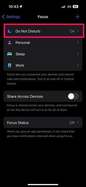 3.Ora puoi semplicementetocca l'opzione Non disturbarein alto per abilitare la modalità Focus sul tuo iPhone.