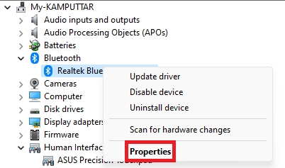 2.Espandi ilBluetoothsezione, fare clic con il tasto destro del mouse suAdattatore Bluetoothe selezionareProprietà.