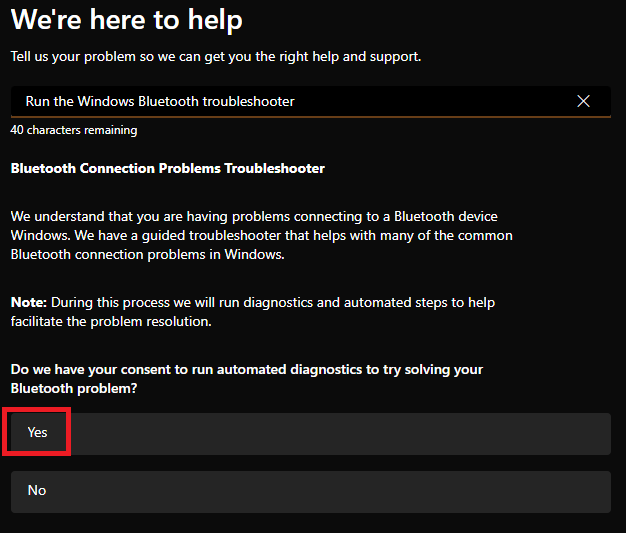 L'esecuzione dello strumento di risoluzione dei problemi Bluetooth di Windows può essere un modo efficace per correggere il blocco dinamico che non funziona in Windows 11. È uno strumento integrato che identifica e risolve automaticamente i problemi comuni relativi al software nel computer.