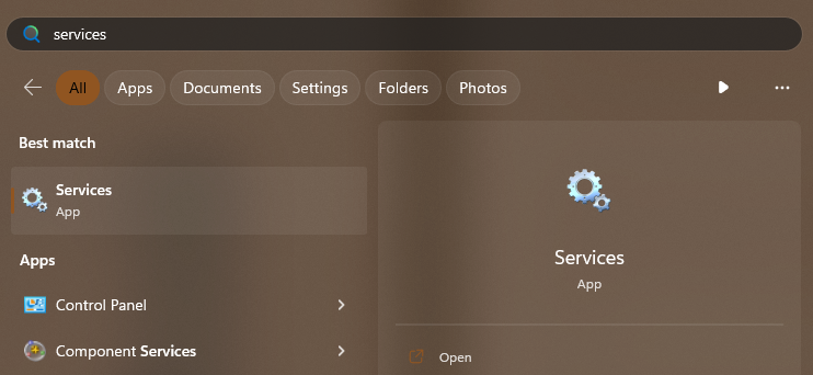 1.Apri ilIniziomenù, tipoServizinella barra di ricerca e premi il tastoEntratasto dalla tastiera.