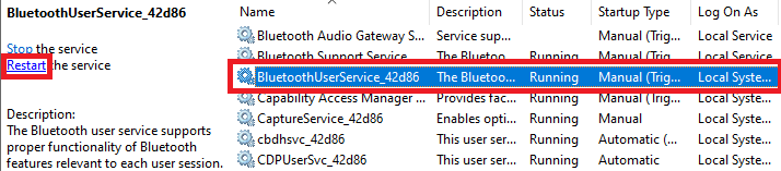 3.Dopo aver riavviato il servizio di supporto, scegli il fileBluetoothUserService_42d86,e riavviarlo.