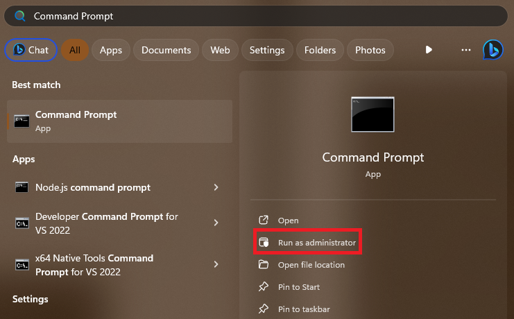 1.CercarePrompt dei comandinella barra di ricerca del menu Start e fare clic suEsegui come amministratoreopzione.