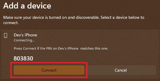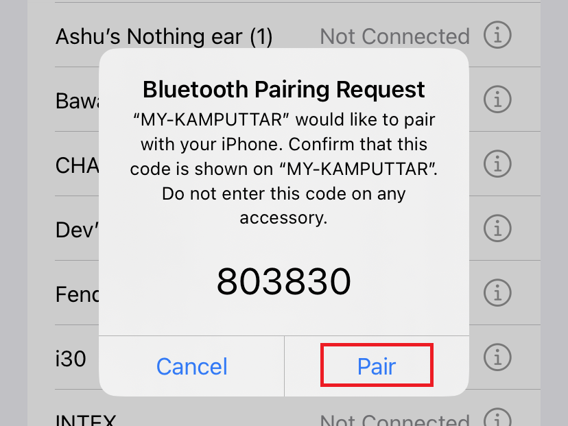 5.Dopo aver fatto clic sul nome del telefono, sullo schermo verrà visualizzata una puntina. Controlla la richiesta di abbinamento sul tuo telefono e, se il codice di abbinamento corrisponde, fai clic suPaiopulsante sul telefono.