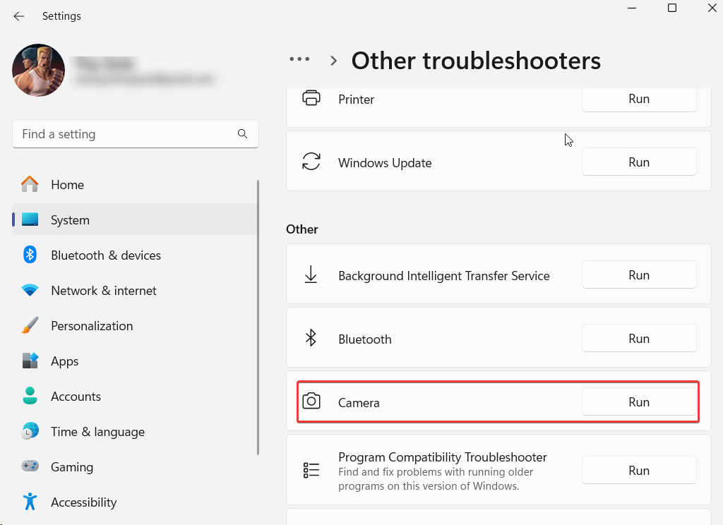 Passaggio 4 –SottoAltri strumenti per la risoluzione dei problemi,fare clic suCorrereaccanto aTelecamera.